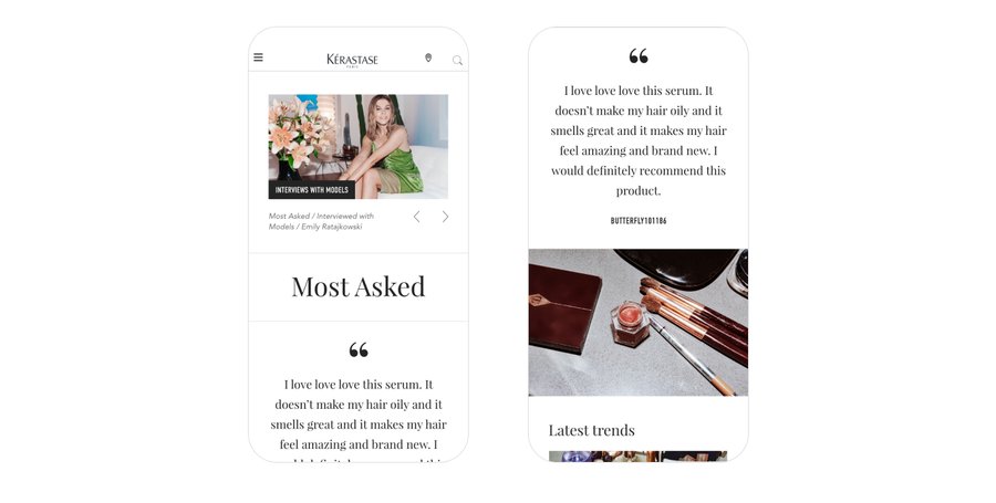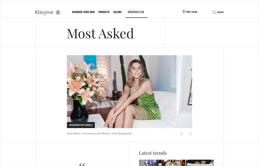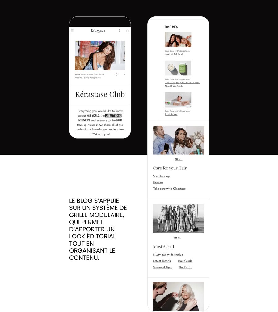 Avec les équipes Kérastase, j'ai participé à la refonte du blog sur leur site groupe : Kérastase Club. L’objectif était de concevoir un design de page hautement désirable et éditorial, tout en restant dans les codes du site actuel. Un travail d’arborescence a été fait pour trier les articles en 4 catégories : HAIR WORLD, LATEST TRENDS, INTERVIEWS et MOST ASKED.